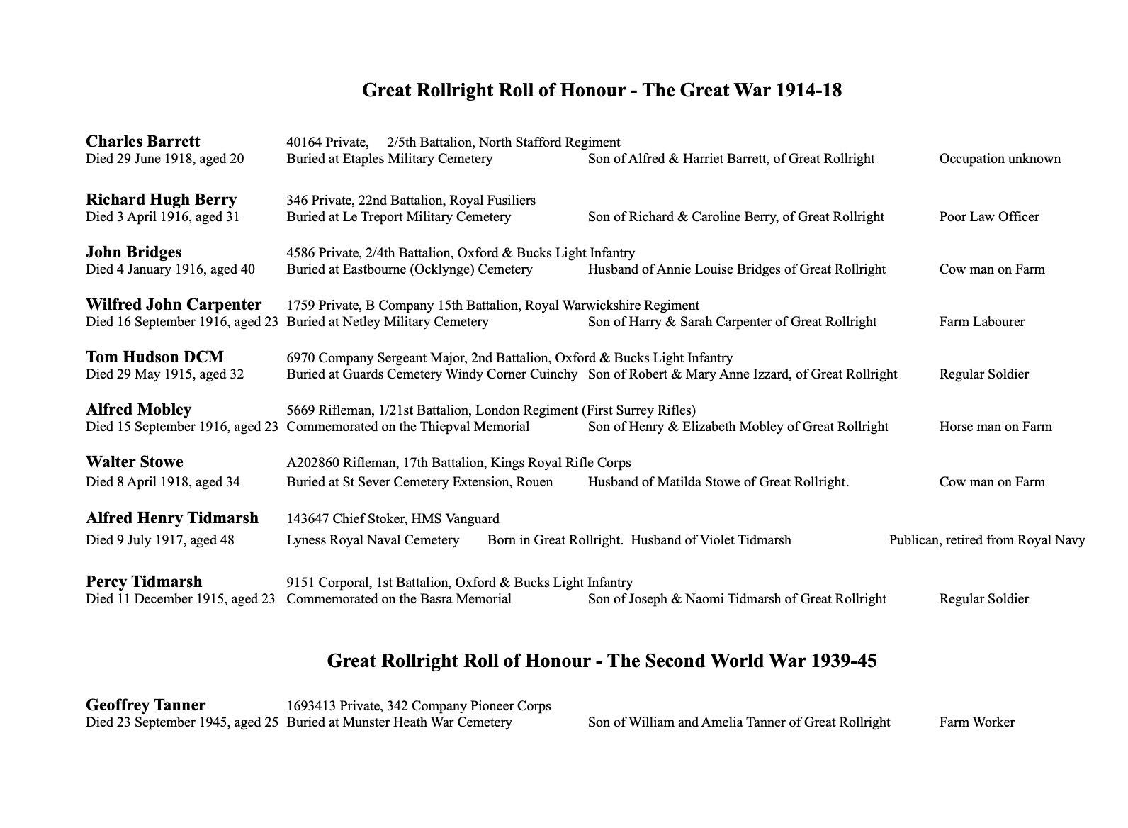 Roll of Honour 1914-1918